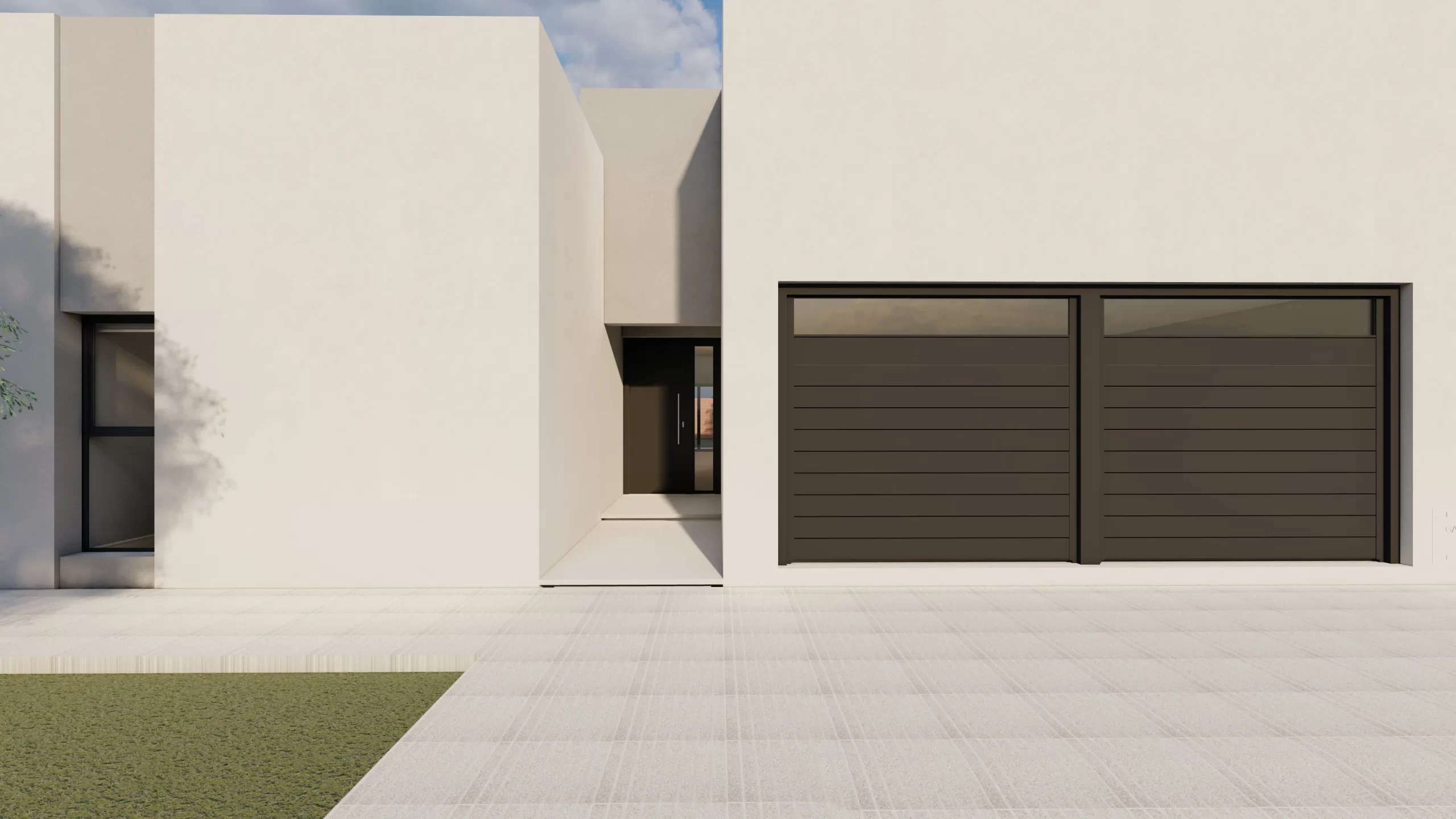 La fachada se presenta con volúmenes puros, líneas limpias y un acceso jerarquizado que enmarca el ingreso a la vivienda.
