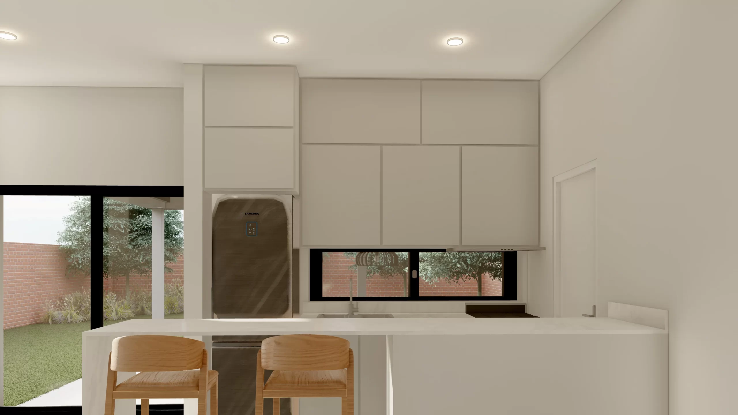En el interior, la vivienda se desarrolla en un gran ambiente social totalmente integrado, donde la cocina, el comedor y el estar conviven en un espacio amplio, luminoso y fluido. Las aberturas se abren hacia el patio, permitiendo que la luz natural acompañe durante todo el día y ampliando visualmente el interior.